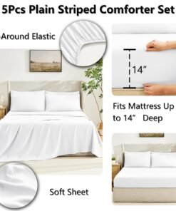 - ELABORATE DESIGN: This bedding set includes a fitted sheet with a pocket for mattresses up to 14″ deep, envelope closure pillowcases to keep your pillows secure, and the comforter features durable box stitching which offers sophisticated look alongside simplicity and will also stable inside filling.