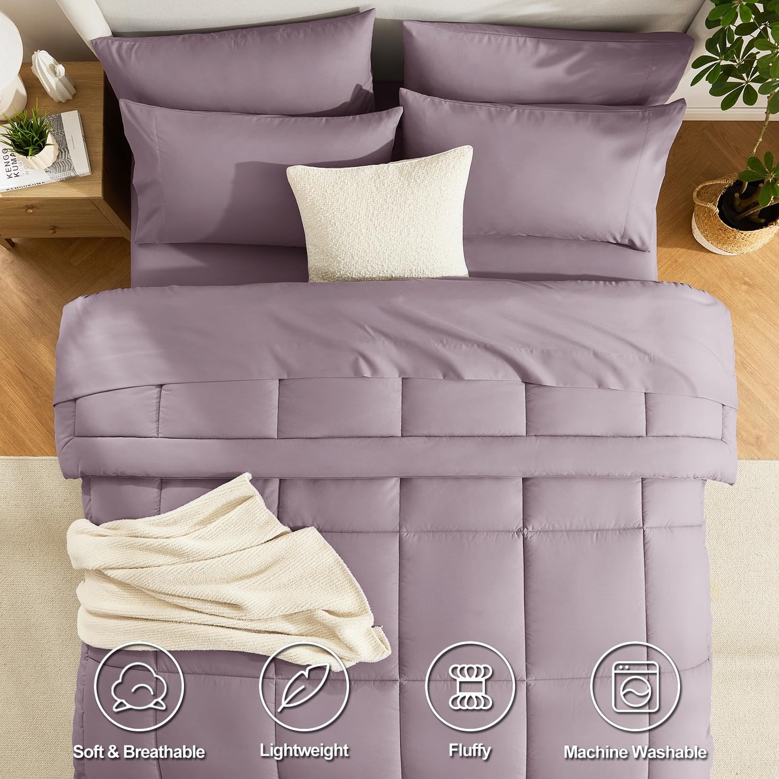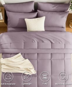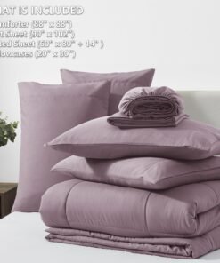 - HOW WE SIZE UP: Queen Size bed in a bag includes 1 Comforter (88″x88″), 1 Flat Sheet (90″x102″) , 1 Fitted Sheet (60″x80″+14″) and 4 Pillowcases (20″x30″); Our bed in a bag is packaged in a vacuum bag, so you can dry it in low heat or tap the comforter gently while baking it in the sun to fluffy again